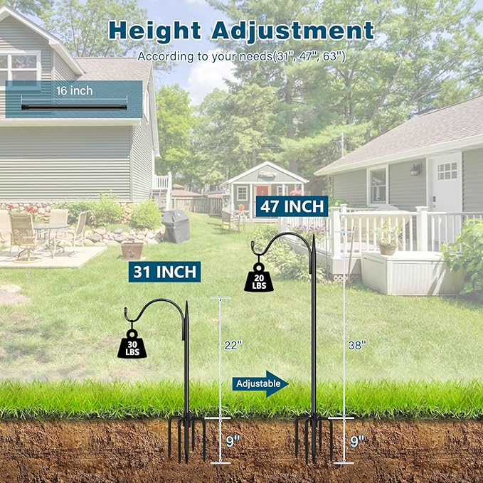 - ?�HIGH QUALITY & ADJUSTABLE??The height of the shepards hooks for outdoor is 47 inch. Our garden hook is made of high quality iron, the black coating on the surface is rust resistant. The height of the shepherds hook for bird feeder can be adjusted by adding or reducing the pole sections, each pole section is 16 inch. So you can adjust the height to 31 inch