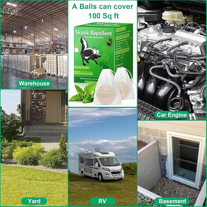 - Friendly Active Ingredients: The skunk repellent balls is made of natural plant ingredients and no harmful for people, pets and plants, follow the manual each ball keep 6-9 ft distance