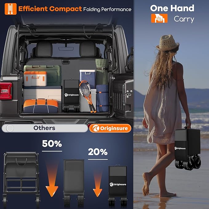 - ใ๐ฃ๐ฟ๐ผ๐ฑ๐๐ฐ๐ ๐ฆ๐ถ๐๐ฒ & ๐๐ฐ๐ฐ๐ฒ๐๐๐ผ๐ฟ๐ถ๐ฒ๐ใOriginsure folding carts unfolded size: 37.40"x 24.21"x 24.00"(42.52"), folded size๏ผ9.06"x 12.20"x 24.00", handle height from Ground: 42.52", with 1 Side Pocket, 2 Mesh Cup holders, 1 Storage Cover, and 1 Strap. Ready to use right out of the box, no assembly required.