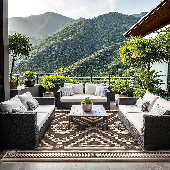 - Extended Lifespan · Dual-Sided Wear Resistance: The GENIMO outdoor rug features a reversible design with two classic geometric patterns, doubling its lifespan through alternating use. The dark-toned surface effectively conceals dirt and stains, maintaining a pristine appearance even in rugged environments. Perfect outdoor patio rugs, rv mats and camping rugs for indoor-outdoor transition zones—effortlessly switch sides for practicality and timeless elegance