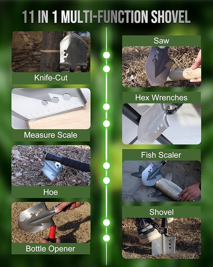 - Multi-functional Shovel - This portable shovel built-in cutter, bottle opener, saw, knife, shovel, measuring scale, hex wrench, hoe, fish scaler, emergency hammer, spade