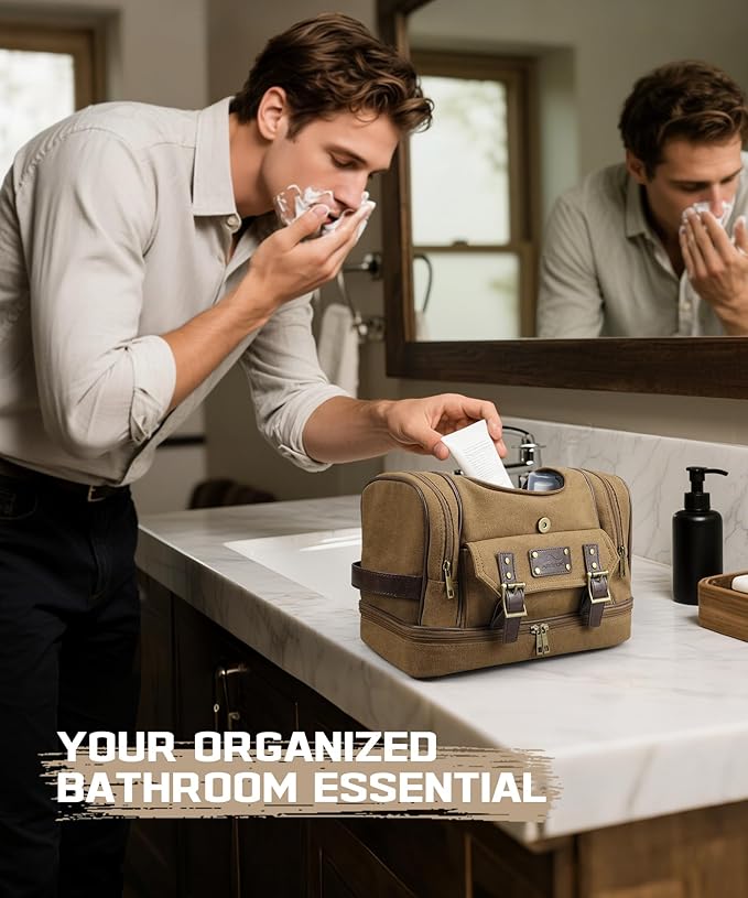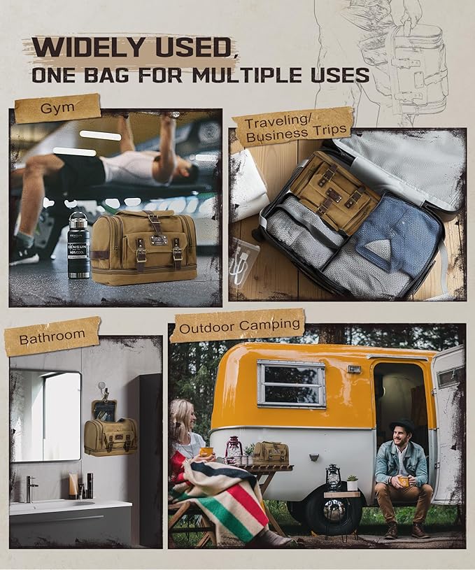 - 【Durable Materials】This mens toiletry bag is made of 16oz washed canvas and PU oil-tanned leather, with a premium vintage texture. The body of the travel toiletry kit is shaped with EVA, which makes the bag strong, sturdy and not easy to deform. The travel pouches for toiletries main pocket has a sturdy metal double zipper to ensure a smooth opening. The front pocket is reinforced with double stitching, more sturdy and durable.