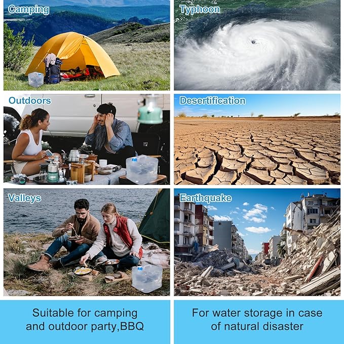 - Use in Emergency Scenarios:Our collapsible water container is ideal for emergency water storage during disasters like tornadoes, fires, tsunamis, or droughts. It’s also great for wild camping, vacat 4 gallons of water or just need a smaller option, these collapsible containers can handle a variety of scenarios where safe, reliable water storage is critical