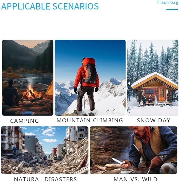 - 【Multi-Functional Survival Gear】: Beyond acting as a sleeping bag, the Emergency Sleeping Bag can be used as a bivy blanket, rain poncho, tent footprint, wind blocker, or even to collect water or melt snow. Its versatility makes it a valuable tool for outdoor survival and disaster preparedness.
