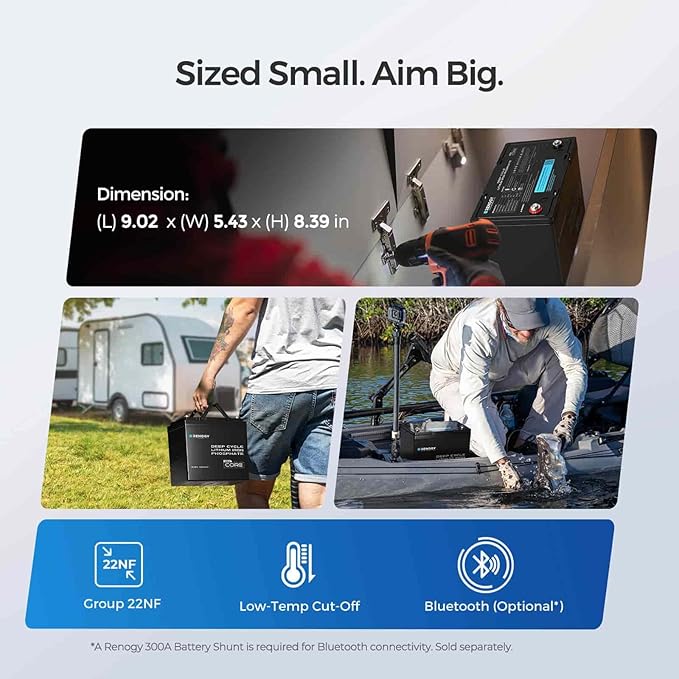 - 【Remote Monitoring (Optional)】With a Renogy 300A Battery Shunt (sold separately), you can keep track of this 12 volt lithium battery via the DC Home app or Renogy ONE monitor for real-time status, even if your 12 volt battery is stored at a hard-to-reach spot in your RV or boat.