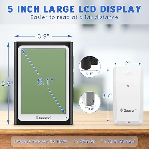 Geevon Large Display Digital Thermometer Hygrometer, Accurate Indoor Outdoor Temperature Humidity Monitoring, Wireless Weather Station with 200ft/60m Range Remote Sensor, Black