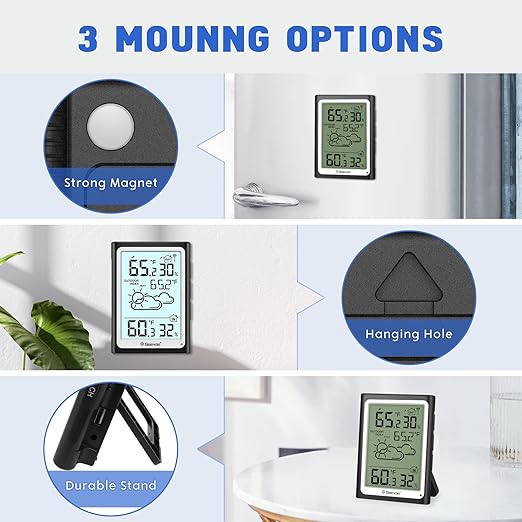 - Large, Clear Display for Easy Readability: Featuring a large, Clear screen, this thermometer ensures easy-to-read temperature and humidity readings from a distance. Ideal for seniors, it provides bold, clear digits for effortless visibility and quick access to the data you need