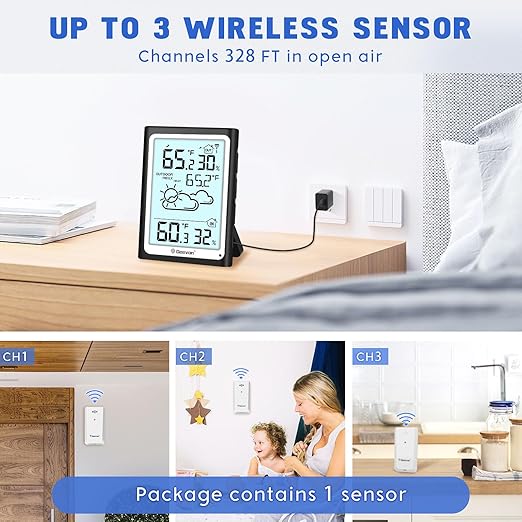 - 3-Channel Monitoring for Comprehensive Environment Tracking: Monitor indoor and outdoor temperatures and humidity levels with 3-channel functionality. Track multiple locations simultaneously (e.g., living room, basement, garden) for a complete overview of your environment’s conditions
