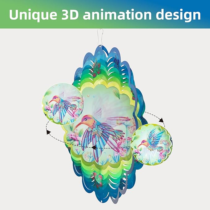 - 【3D Animations Hummingbird Spinner Decor】The magical Hummingbird style inspires the decorative hanging wind spinner, With a beautiful 3D dynamic pattern of the Hummingbird creates a magical 3D animation visual effect through different angles on the surface. The unique design make it seems more visual. Suitable decorate your garden and patio.
