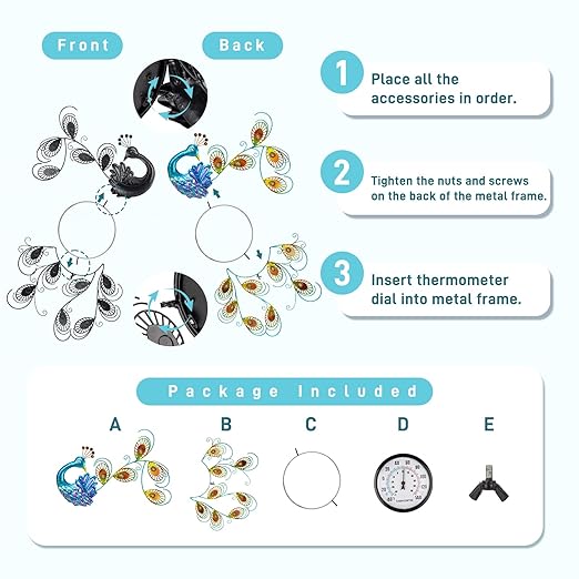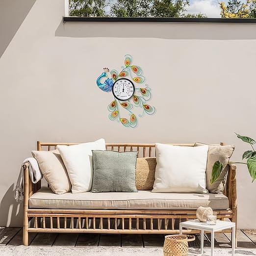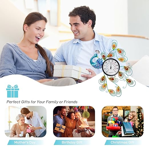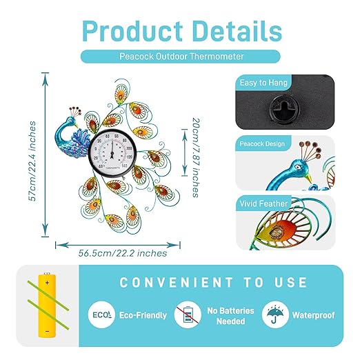 - 【Exquisite Design】This outdoor thermometer is a stunning piece of garden decor, featuring a vibrant peacock design. Each feather is meticulously designed with a lifelike appearance. This versatile decorative outdoor thermometer can be used in a variety of settings, including patio, garden, greenhouse, warehouse, office, baby room, etc