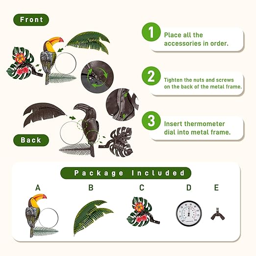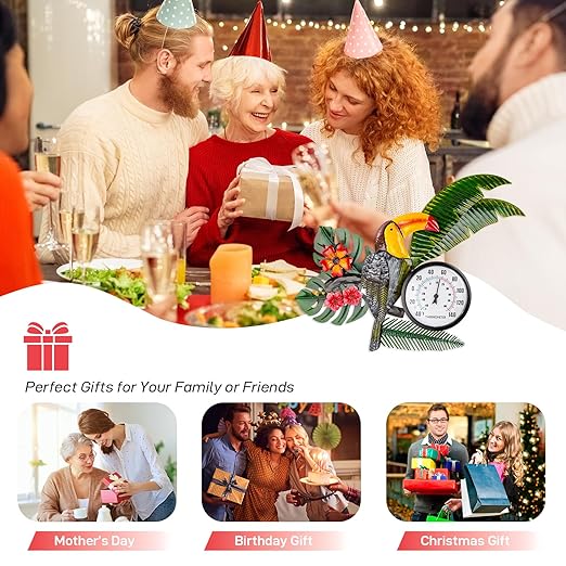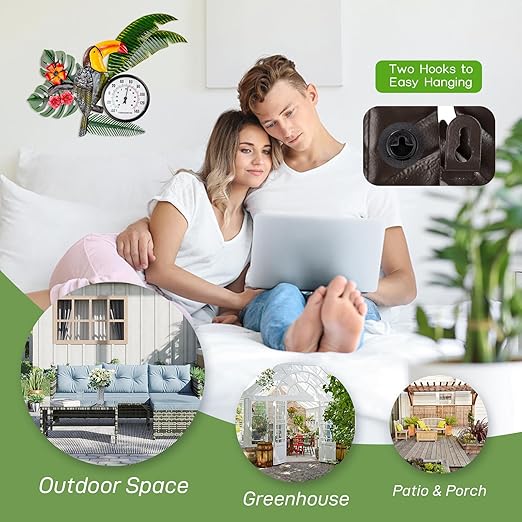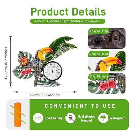 - 【Exquisite Design】Add a tropical vibrancy to your outdoor decor with this exquisite toucan-themed outdoor thermometer. It features a vividly colored toucan perched on a branch, surrounded by lush green leaves and vibrant flowers, capturing the essence of a tropical paradise, making this outdoor thermometers for patio a perfect accent for those looking to create an exotic ambiance.