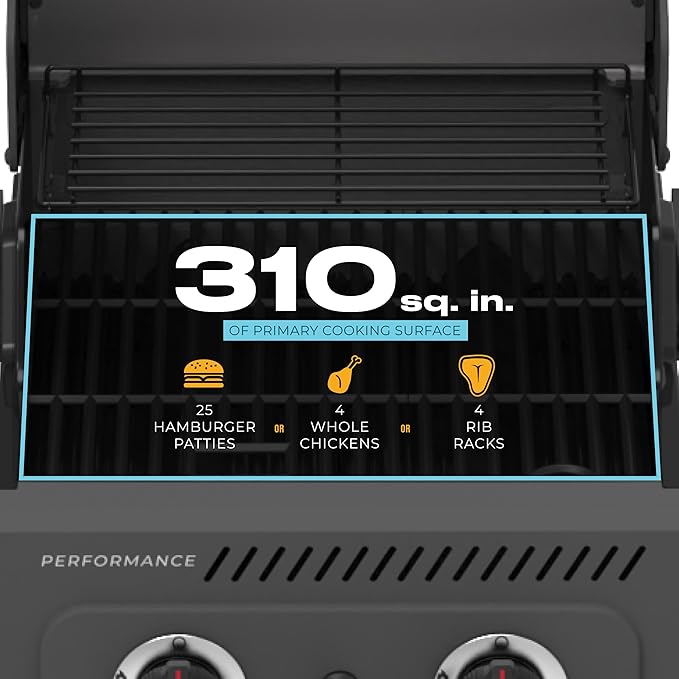 - COOKING AREA: Enjoy 310-square-inches of cooking space to grill up to 17 burgers at a time. Easily multitask with the 85-square-inch swing away warming rack to cook with indirect heat or to keep food warm.