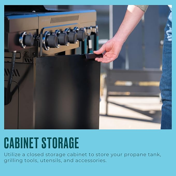 - STORAGE: Utilize a closed storage cabinet to store your propane tank, grilling tools, utensils, and accessories.