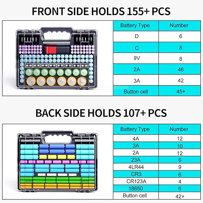 - Large Capacity Battery Compartment - Battery organizer storage and protects a large number of batteries! Holds 58 AA, 52 AAA, 12*AAAA, 6*D, 8*C, 10*CR2, 6*CR123, 10*4LR44, 6*23A, 6*18650, and 50 button cell batteries. Great for organizing and storing any battery pack.