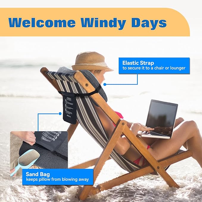 - SECURE AND STABLE IN EVERY BREEZE: Equipped with a detachable elastic strap, this inflatable pillow easily secures to your beach chair or lounger, staying put despite coastal winds. The built-in sandbag allows you to weight it down with sand, ensuring it won’t blow away. Enjoy peace of mind and uninterrupted relaxation, even on the breeziest of days.