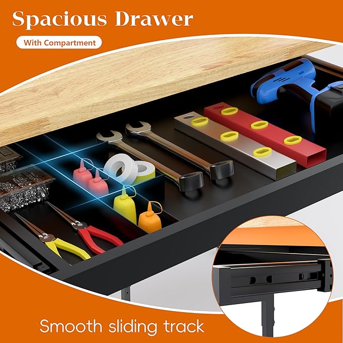 - Heavy Duty Workbench with Drawer: Features a 2" deep drawer with high-quality smooth slides supporting up to 100 lbs. Spacious enough for screwdrivers, wrenches, and small power tools. Includes a removable iron compartment, placeable on the left or right side for flexible storage