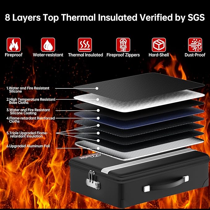 - Fireproof and Waterproof Material: Our fireproof boxes consist of 8 layers of top-quality insulation, fireproof zippers, and fireproof threads, and are SGS certified to UL-94 VTM-0 which effectively protects your belongings from carbonization in case of fire