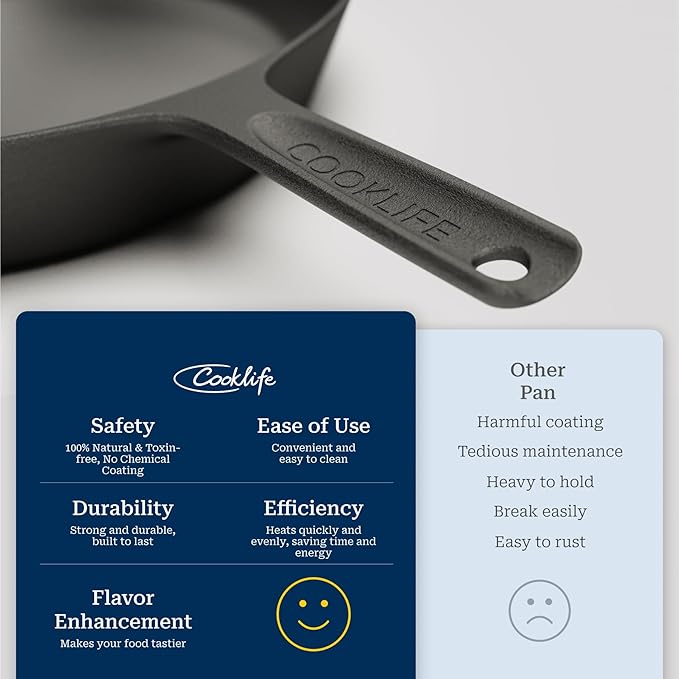 - Healthy Choice for Your Kitchen: COOKLIFE cast iron pan is completely free of harmful chemicals like PFAS, PFOA, PTFE, PFOS, and Teflon, ensuring a safe and healthy cooking experience for you and your family. The smooth-polished surface combines modern technology with the time-tested quality and performance of traditional cast iron.