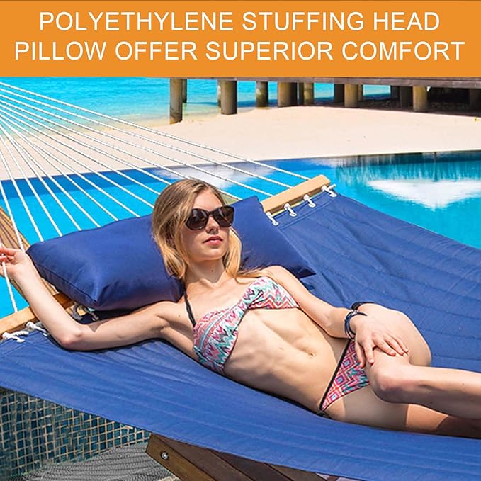- SUPER COMFY: The double-layered quilted polyester with inner polyester padding and a polyethylene stuffing head pillow offer superior comfort. This quilted hammock can give you a cloud-like comfortable experience. Lying on it is like being in a warm embrace. No matter it's in summer or winter, this hammock will always be your first choice for relaxation