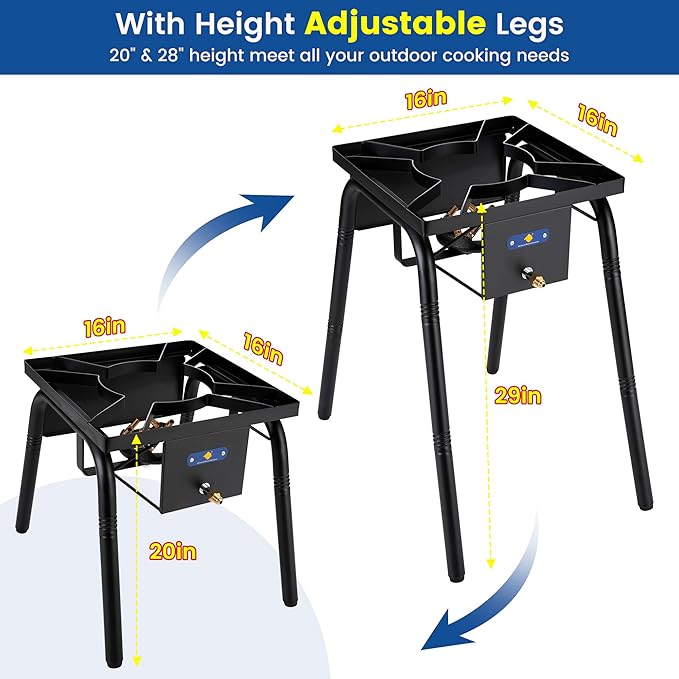 - Height Adjustable Legs(29"&20" models) - Customize for Stability & Comfort - Need a lower profile for large batches? Opt for the 20" model. Prefer standing-height convenience for frying? The 29" version keeps your back happy. Both models feature non-slip, reinforced joints to prevent wobbling, even on uneven ground.