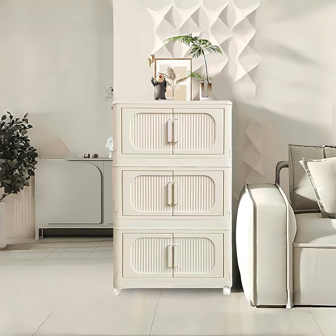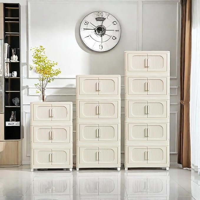 Holaki 117 QT Storage Bins with Lid, 3 Tier Collapsible Closet Organizers, Stackable Plastic Storage Bins Cabinet with Wheels and Magnetic Door, Opaque