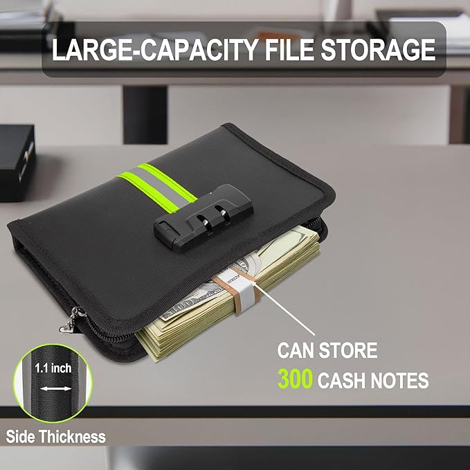 - Large Capacity:the fireproof document bag with lock&zipper,This fireproof bag holds up to 300 bills for unmatched capacity. Perfect for professionals, business owners, and anyone who needs reliable storage