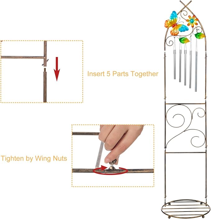 - Elegant Design: This plant pot stand features a charming back trellis for climbing plants and a robust bottom holder for flower pots. Decorated with vivid colorful butterfly; flower and wind chime. Make it to be a beautiful and functional addition to garden