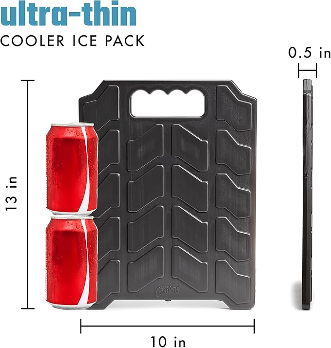 - XL COOLER ICE PACK - Our large ice packs for coolers are built for durability and ultimate cooling power. Reusable ice packs measure 10" x .5" x 13". It's slim design allows the ice packs to fit seamlessly into the top or sides of any large cooler.