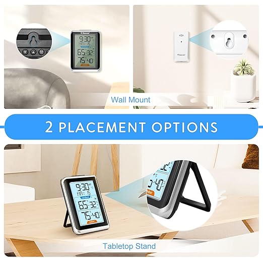 - [Large LCD Screen with Backlight] Digital thermometer hygrometer features a 3.8 inch backlit LCD for clear readings in bright or dim environments with a soft light blue backlight that stays on for 10 seconds making it easy to check temperature humidity and clock in low light(backlight cannot always on)