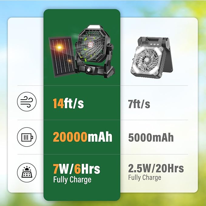 - 🌞【7W High Efficiency Solar Panel】- The solar panel is covered by monocrystalline silicon solar cells, the solar panel adopts multi-layered cell technology to generate energy from the sunlight and perform better with higher conversion efficiency that up to 23% than other conventional panels, and it only takes 6 hours to fully charge the 20000mAh camping fan.