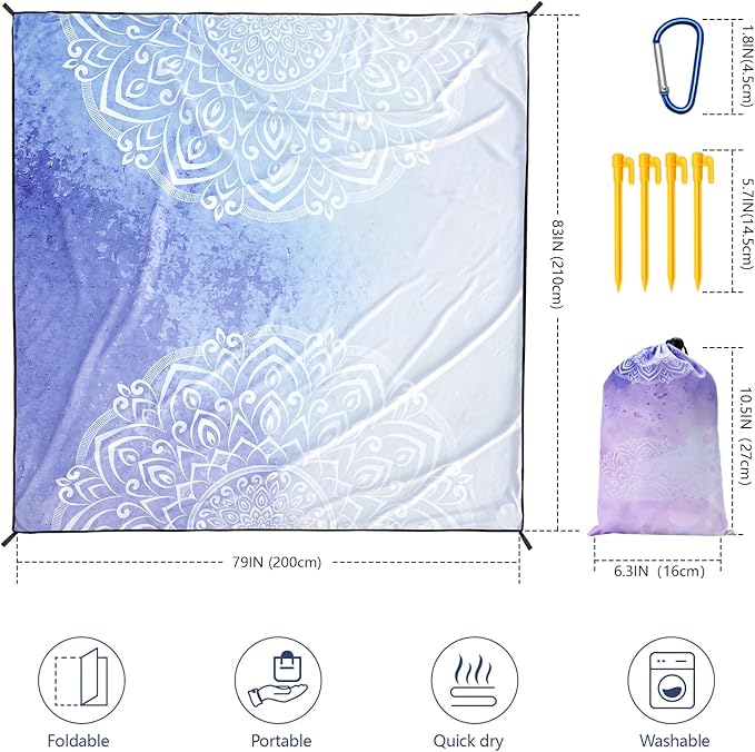 - đ´ăLightweight Beach Itemsă79"*83" beach blanket oversized, weighted 0.71 lbs, fit 1-3 adults, and they can be easily folded into a 5.1"Ă7.5" carry bag.