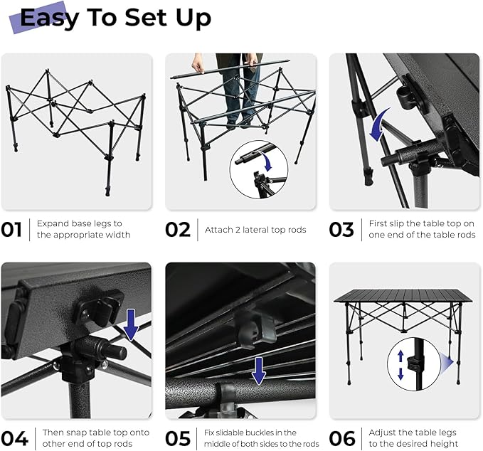 - Adapt To Uneven Ground: This foldable table has four adjustable height legs. You can adjust the length of each leg individually to keep the tabletop level according to the uneven ground. The buckle design allows for easy and quick operation without tools