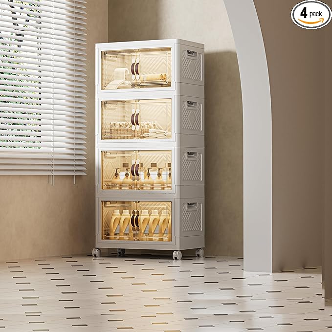 144 QT / 36 Gal Stackable Storage Bins (1 Lid) w/Wheels & Magnetic Doors, Collapsible Plastic Organizer Cabinet for Closet Office Garage - White Storage Containers