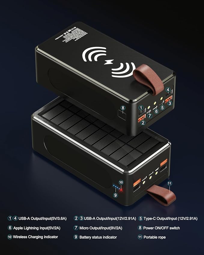 - 3. 3-Way Charging Versatility: Solar panel provides emergency power (5W input); 15W wireless pad for cable-free convenience; 7 ports including USB-C PD 3.1; Charge 8 devices at once from wall outlet, car, or sunlight