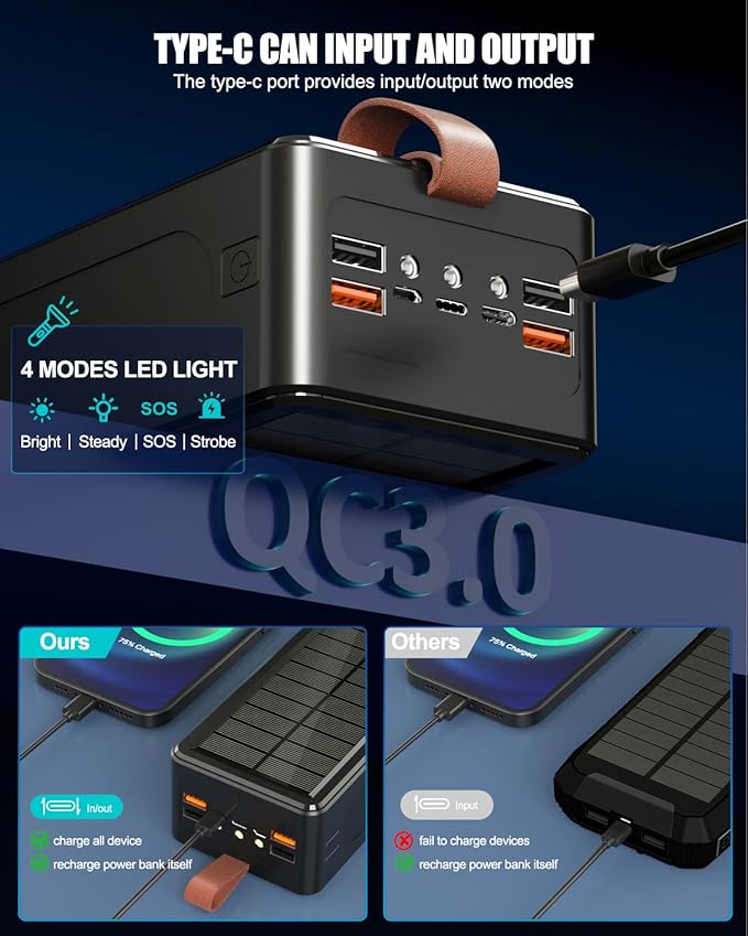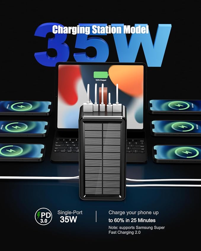 - 2. 35W PD & QC 3.0 Power Bank Fast Charging: Recharge iPhone to 50% in 18 minutes; Auto-adjusts power for AirPods (7.5W), Switch 2 (35W), and VR headsets;Overheating/short-circuit protection tested in extreme temperatures; [Charging Indicators] 1) Wired Charging (Blue Indicators): The 4 lower lights (25%, 50%, 75%, 100%) flash blue to display battery level, only 4 lights become blue when fully charged; 2)Top Indicator Functions: Red flashing: Wireless charging is active;Green flashing: Solar charging is in progress;