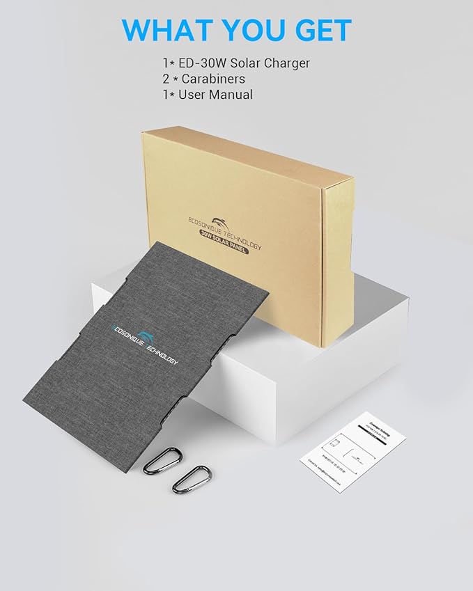 - Package Includes: 30W Solar Panels* 1, Carabiners* 2, Manual* 1. We offer a 12-month warranty. If you encounter any issues with the product, please get in touch with us, and we will respond within 24 hours