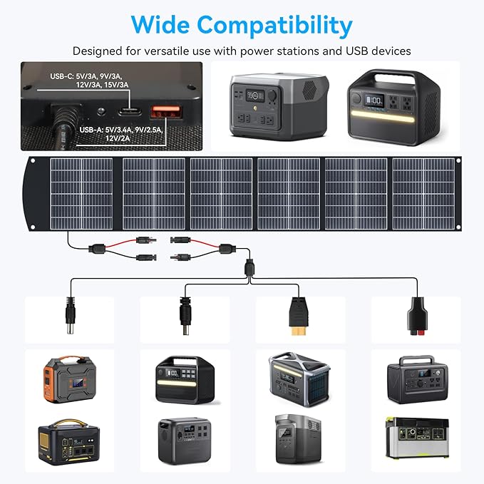 - Wide Compatibility: Features 20V MC4 direct output with a 3M MC4 cable and includes a 0.5M MC4 to XT60, Anderson, DC7909, and DC5525 cable, making it compatible with EcoFlow, Jackery, Bluetti, Anker, and other power stations. Also supports direct charging for laptops, smartphones, tablets, and battery packs with USB-C PD3.0 (45W) and USB-A QC3.0 fast charging