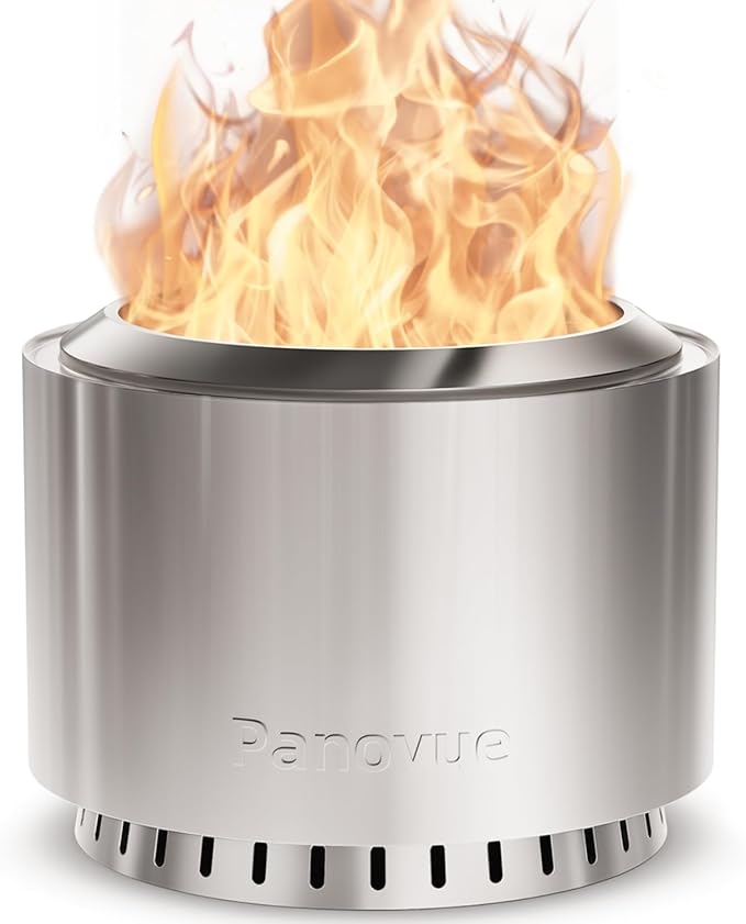 - [Low Smoke Design]: Panovue smokeless fire pit has unique design and scientific internal airflow system, provides you with a clean flame atmosphere. No more sting the eyes smoke, no more suffocating air - just the enough warmth and ambiance of low smoke fire pit. We send a waterproof cover and a poker to you for using the low smoke fire pit more convenient.