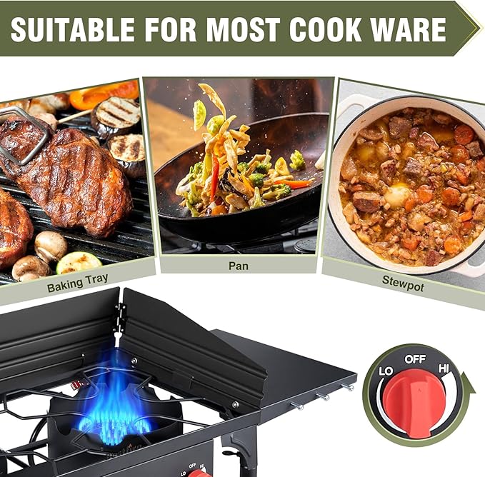 - đ¸ăHigh Power OutputăThe 150000 BTU stove has a strong flame and is equipped with multiple independent burners, each of which outputs up to 75,000 BTU, suitable for quickly cooking large quantities of food, such as frying fish, steaming crabs, or wok cooking