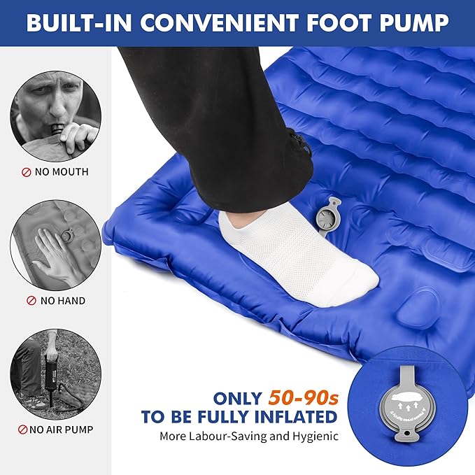 - đď¸ăQuick Inflation & DeflationăSimply foot stomp to inflate, allowing you to inflate your campping sleeping pad within 2 mins only and also avoids introduce moisture into the interior by mouth blowing. And the deflation valve has the double-decked design with a multi-functional which is used for fast deflating.