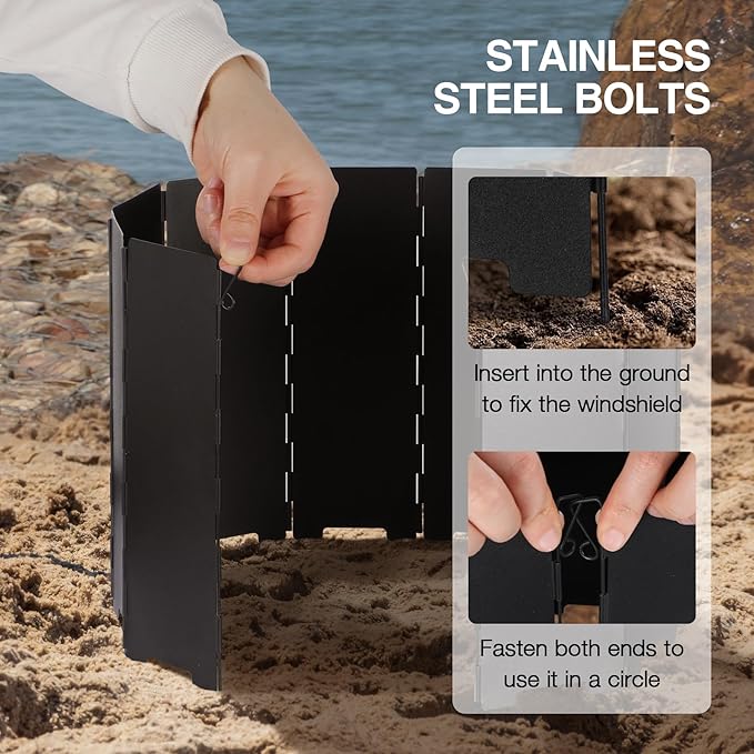 - Premium Quality Material: Crafted from high-quality aluminum, this folding windscreen is rust-resistant and corrosion-proof, ensuring durability and longevity. The stainless steel bolts on either side secure the windscreen in place, providing stability during use.
