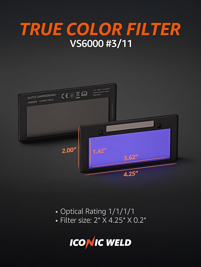 - Auto-Darkening Filter Options: Choose between VS6000 (fixed #3/11) or VS8000 (variable #4/9–13) cartridges with true color clarity and fast switching.