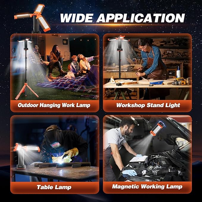 - 【Multi-Functional Camping Light】Saker camping light with stand fixtures have three rotatable light panels that can be adjusted vertically by 180 ° and horizontally by 270 °, allowing for precise adjustment of lighting angles in multiple directions. The work light is detachable and its magnetic base is equipped with a hook, providing more possibilities. Whether you are lighting up at an accident scene, working in a garage, or sitting at a campsite, ourrechargeable camping light can meet your needs.