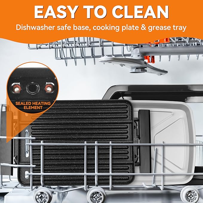 - [EFFORTLESS CLEANUP]: Beyond being non-stick and wipe-clean, the removable cooking plate and grease tray are dishwasher safe, transforming cleanup into a simple task.