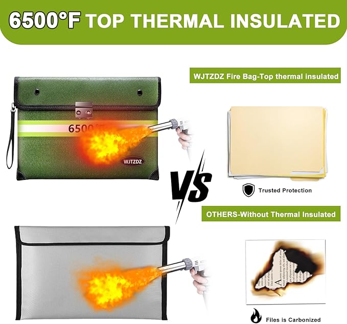 - ⚠️(Note) Fireproof does not mean it can withstand a long fire, and waterproof does not mean it can be immersed in water for a long time.It just gives you enough time to rescue your valuables. 🔥【6500°F Top Fireproof】The upgraded fireproof bag has passed the global flammability standard (US laboratory) and vertical burning test (SGS UL94 V-1) and can withstand temperatures up to 6500°F, far exceeding the typical fire temperature.