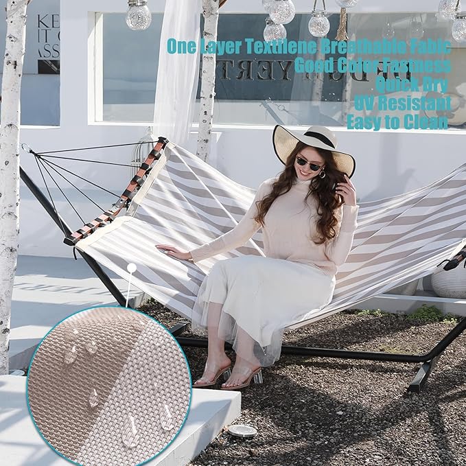 - ★Quick Dry Hammock: This double hammock bed is made of Textilene which is breathable, comfortable, weather resistant, and oil proof. The fabric is easy to clean and dry. No more worries of hammock get dirty.