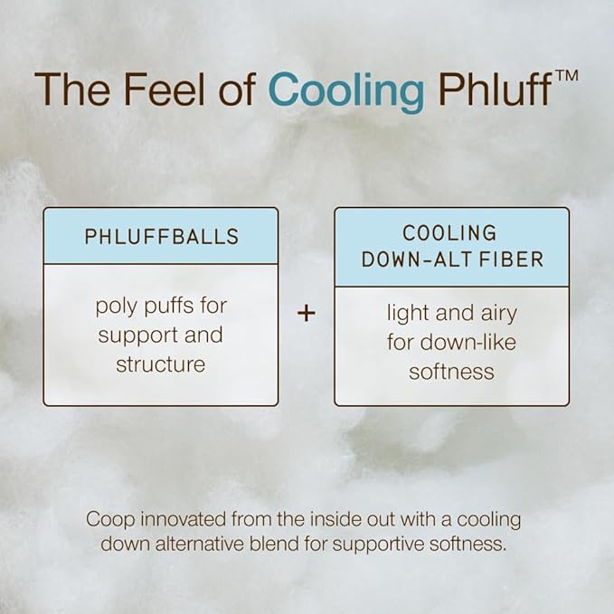 - Down Alternative Fill, Without the Down Price: Soft, breathable, and light-as-air, our proprietary blend of Phluff balls, down alternative fibers, and cooling PCM-coated strands delivers the feel of a premium down pillow without flattening, bunching, overheating, and without the high price of a down pillow. Engineered to be soft and breathable like hotel pillows but structured enough to hold their shape and support your head and neck throughout the night.