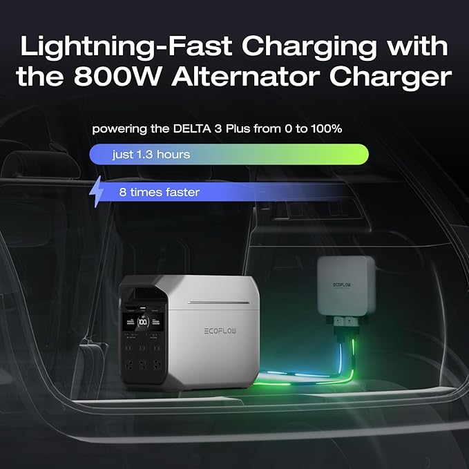 - 5 Fast Charging Options. With 1500W AC input, it charges to 80% in 40 mins. Solar charging reaches 80% in 1 hr, 100% in 70 mins. The 800W Alternator charges to 80% in 1 hr, 100% in 1.3 hrs. EcoFlow smart generator charges to 80% in 40 mins, 100% in 56 mins. Hybrid (AC + solar) charging also reaches 80% in 40 mins, 100% in 56 mins.