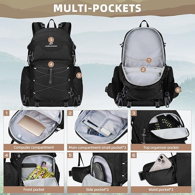 - Spacious And Organized Storage Space: The large capacity hiking backpack measures about 13.4*8.6*22" (W*H*D), capacity: 40 liters. lightweight backpack is equipped with a spacious backpack with zippered main compartment, 2 front zippered pockets, 2 waist zippered pockets, 2 side pockets and 2 mesh pockets, which can efficiently store and categorize different items