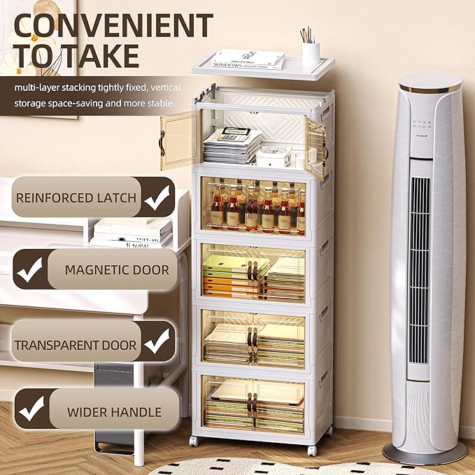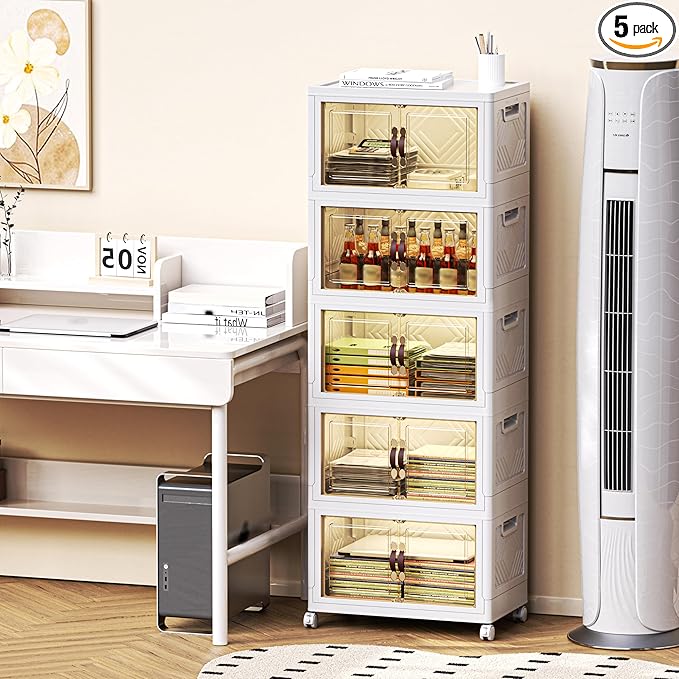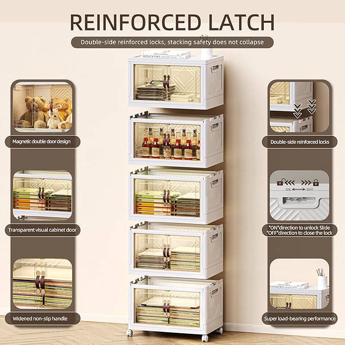 248 QT / 62 Gal Stackable Collapsible Storage Bins (1 Lid) with Magnetic Doors & Wheels - Plastic Cabinet Organizer for Home Office Closet, White Space-Saving Containers
